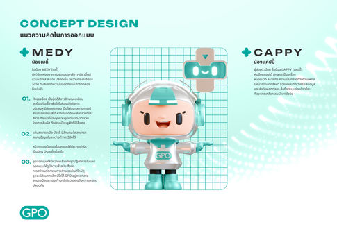 โดยออกแบบให้มีความสอดคล้องกับวิสัยทัศน์ขององค์การเภสัชกรรม องค์กรหลักเพื่อความมั่นคงทางยาและเวชภัณฑ์ของประเทศ ที่ชาวไทยไว้วางใจ และภาคภูมิใจ โดยออกแบบให้มีมาสคอตหลัก ชื่อน้อง mEDY (เมดี้) นักวิจัยแห่งอนาคตในชุดแลปสูทสีขาว-เขียวมิ้นต์ แว่นโปร่งใส สะอาด ปลอดเชื้อ มีความกระตือรือร้น ฉลาด ทันสมัย รักความปลอดภัยและการทดลองที่แม่นยำและผู้ช่วย ตัวน้อย ชื่อน้อง cappy (แคปปี้) หุ่นน้อยลอยได้ ลักษณะเป็นเครื่องหมายบวก หมายถึง ความเป็นกลางทางการแพทย์ มีหน้าจอแสดงสีหน้า ช่วยจดบันทึก วิเคราะห์ข้อมูล และส่งต่อผลทดลอง สื่อถึง ระบบช่วยอัจฉริยะ ที่องค์กรเภสัช กรรมนำมาใช้จริง